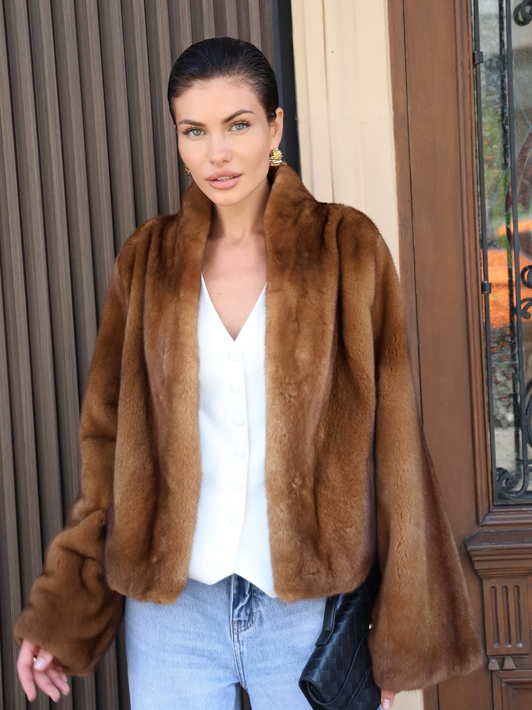 Adoptez une sophistication sans effort avec The Abelarda, un chef-d'œuvre du luxe moderne. Confectionnée en fourrure de vison 100 % authentique, cette veste exquise séduit par son ton brun foncé élégant et sa texture irrésistiblement douce. Redéfinissant l'élégance classique. Conçue avec un col montant, une silhouette épurée et des poignets pliables raffinés, elle passe aisément du jour à la nuit.