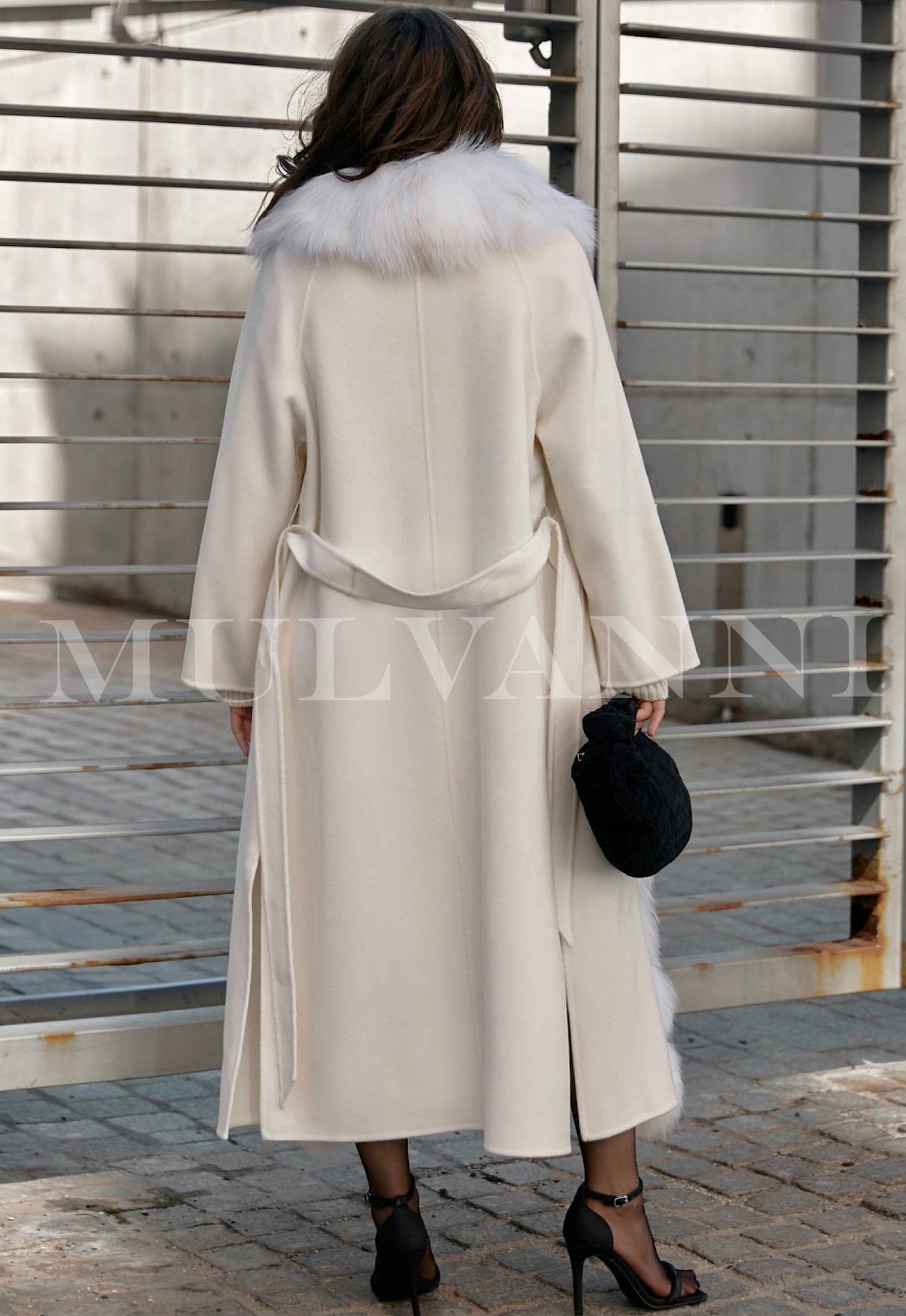 Confectionné avec expertise pour une silhouette parfaite, ce manteau blanc cassé est fabriqué en cachemire double face 100 %, offrant à la fois structure et douceur. Des lignes épurées et une coupe impeccable garantissent qu'il met en valeur toutes les silhouettes, tandis qu'une ceinture assortie en cachemire cinte la taille pour une forme raffinée et féminine. Le design est sublimé par une luxueuse bordure en véritable fourrure de renard croisé qui descend le long de l'avant, ajoutant une chaleur indulgente et une sophistication intemporelle.