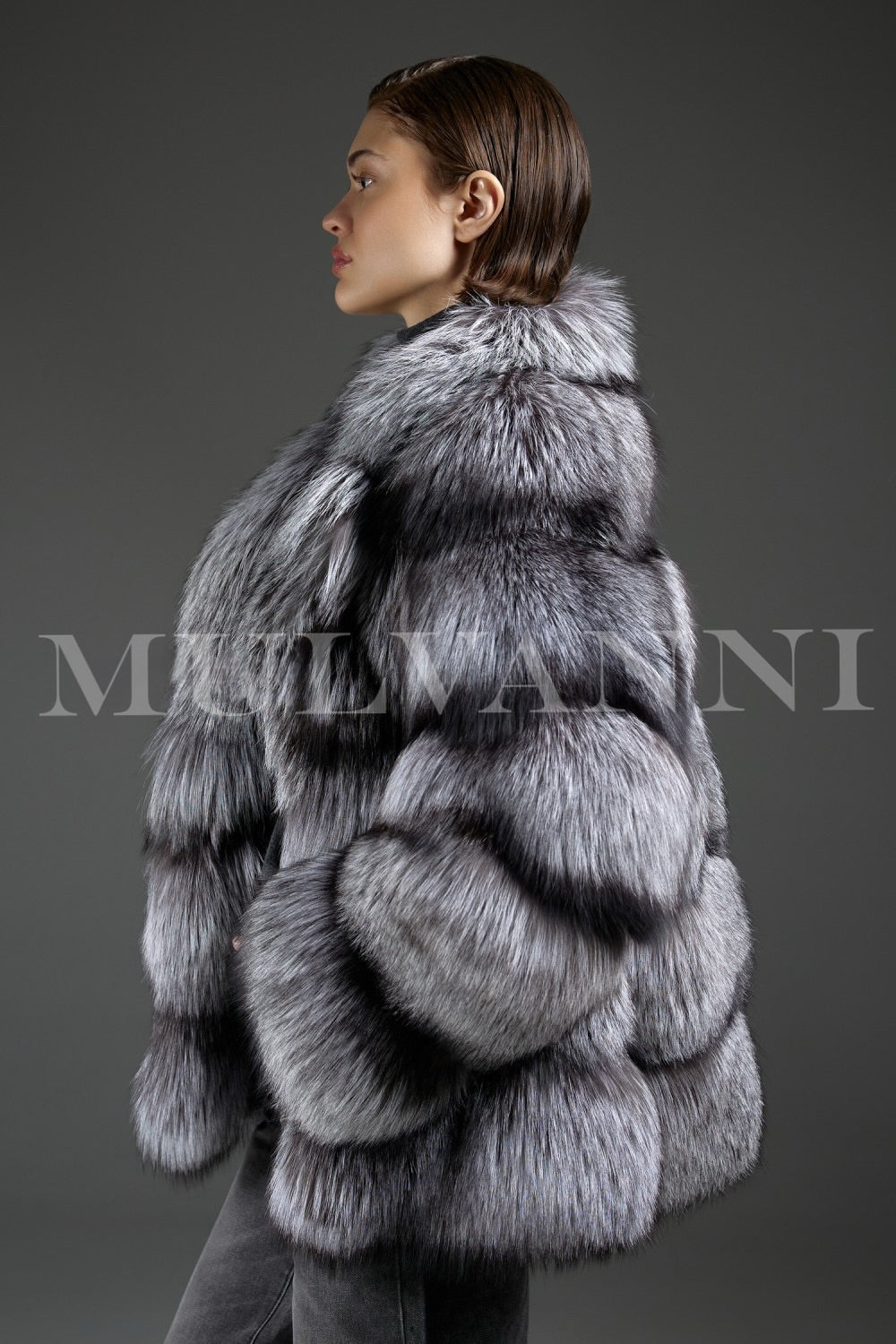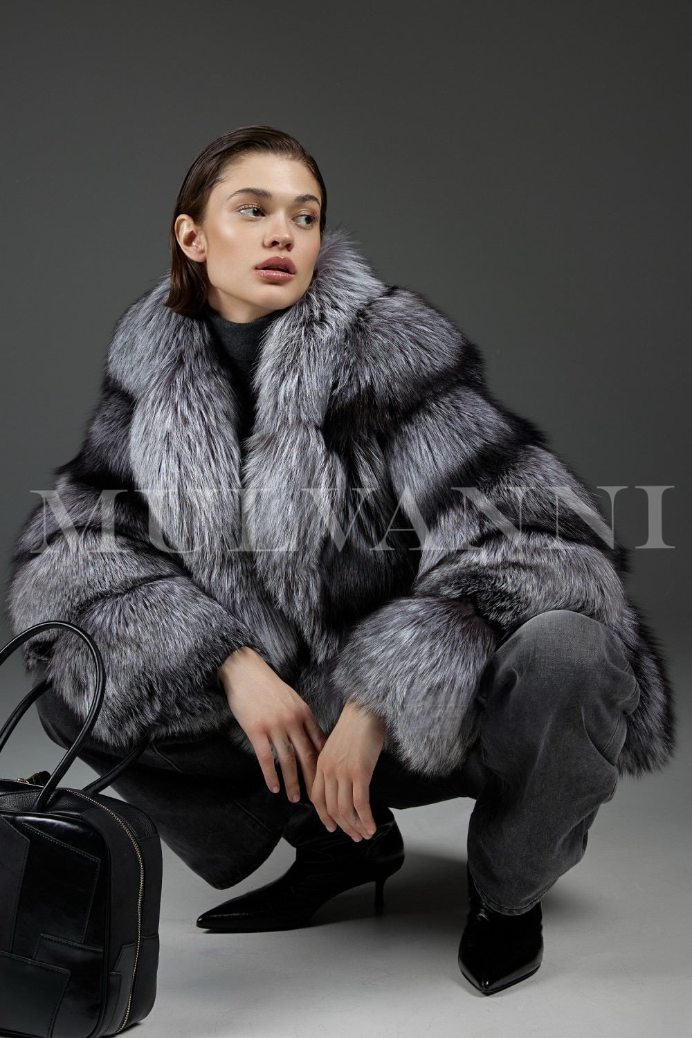 The soft, dense Silver Fox Fur drapes the woman stylishly, while a trendy black leather handbag completes the high-fashion cold-weather look.