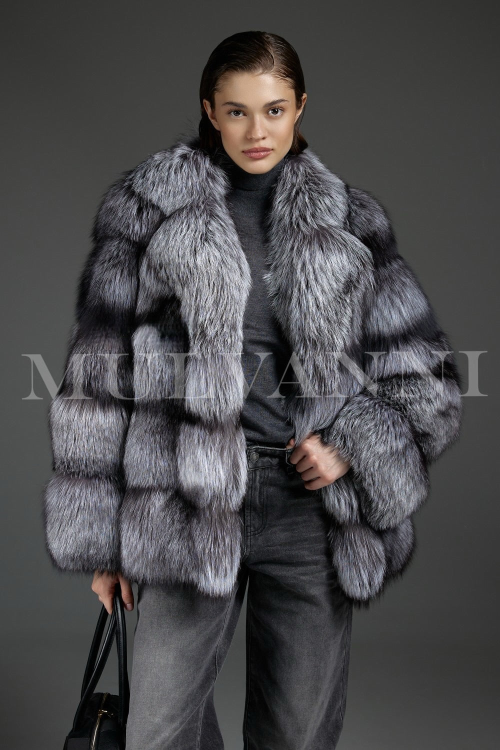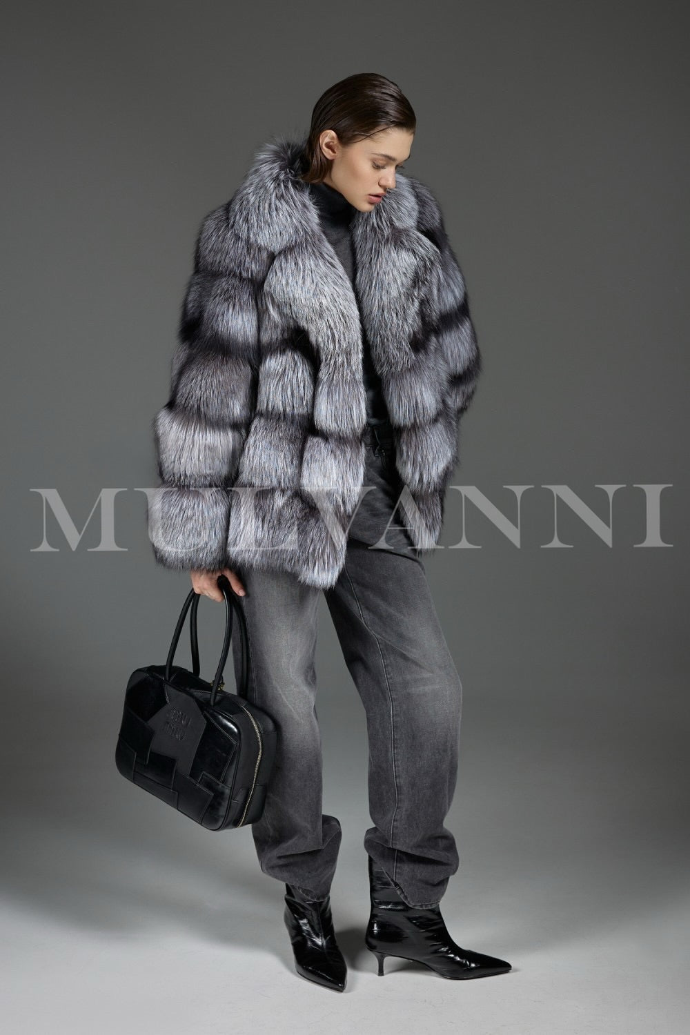 Styled in a luxurious silver-toned fox fur coat, the woman adds a modern edge with a structured black leather bag, blending elegance with urban chic.